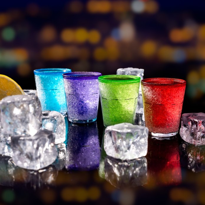 Kolorowe kieliszki z wypełnieniem, które chłodzi alkohol.